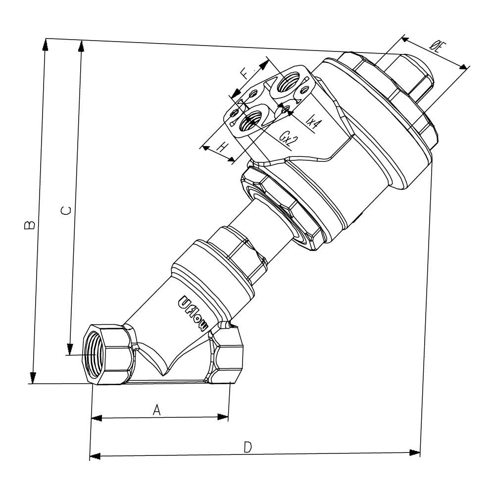 Uflow 1.1/2 Inch Angle Seat Valve - 1.1/2 Inch Y Type Pneumatic Control Valve with Plastic Operator SS Body (0 - 16 Bar) NC/Bi-Directional - Screwed End